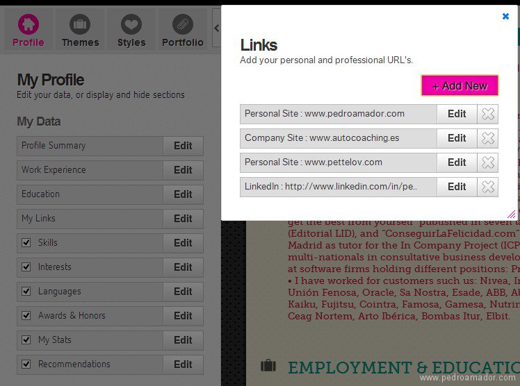 Con esto ya habremos importado nuestro currículum a la aplicación web y sólo queda perfilar un poco los colores que nos gustan, los contenidos que queramos incluir, las habilidades que queramos mostrar, los cursos recibidos (ya que quizás no queramos hacer mención a algunos muy antiguos), etc.